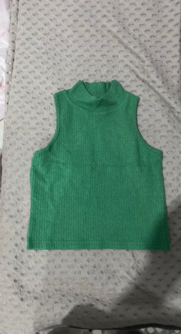 Yeşil renkli, boğazlı ve kolsuz örgü süveter, yumuşak dokulu kumaştan üretilmiştir. Günlük kullanıma uygun, rahat ve şık bir tasarıma sahiptir.