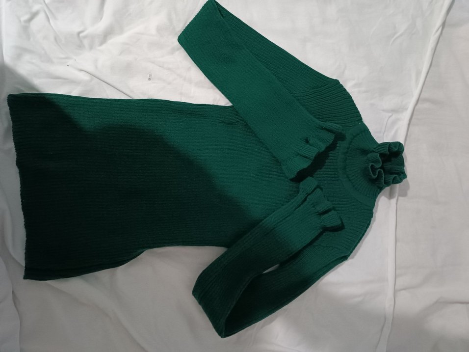 Bu yeşil boğazlı kadın kazak, triko dokusuyla ve fitted kesimiyle dikkat çeker. Uzun kollu ve midi uzunlukta, rahat sokak stiline uygundur.