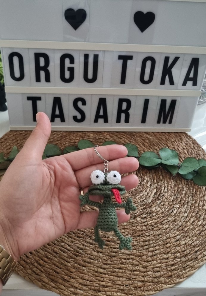 Yeşil renkli, bohem tarzda, örgü kurbağa figürlü anahtarlık. Rahat ve retro bir görünüm sunar.