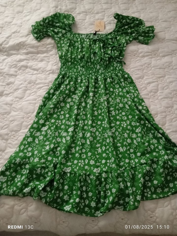 yeşil renkli, kısa kollu elbise. bel lastikli ,fırfır detayları bulunur. Tie-dye deseniyle retro bohem tarzını yansıtır.