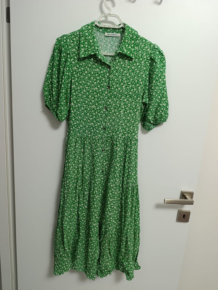 Kısa kollu, yakalı ve düğmeli uzun yeşil elbise. Bol kesim ve renkli çiçek desenli, bohem vintage tarzı için uygun.