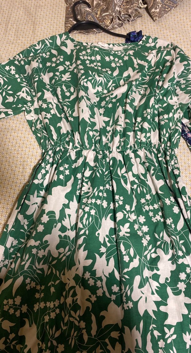 Hafif yeşil renkte, bol kesim ve kısa kollu hamile elbisesi. Baskılı desen, fırfır detayları ve yuvarlak yaka bulunur, günlük kullanım için uygundur.