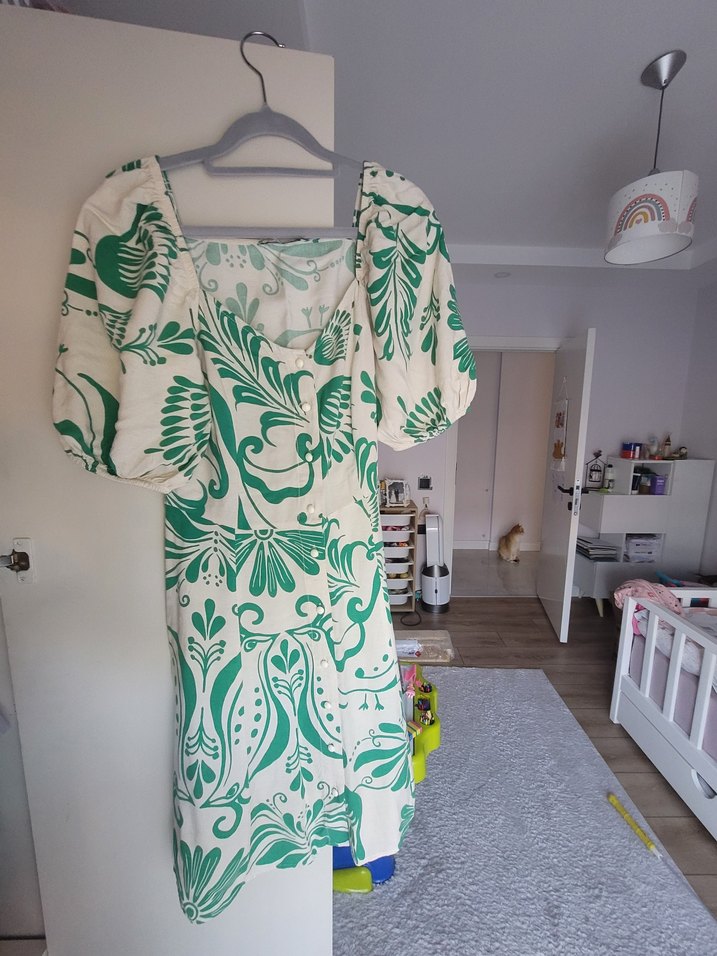 Hafif yeşil tonlarında, sentetik kumaştan, kısa balon kollu, drapeli straplez yaka ve bol kesim bohem midi elbise. diz altinda astarsiz ince ama ic gostermiyor #elbise #desenlielbise