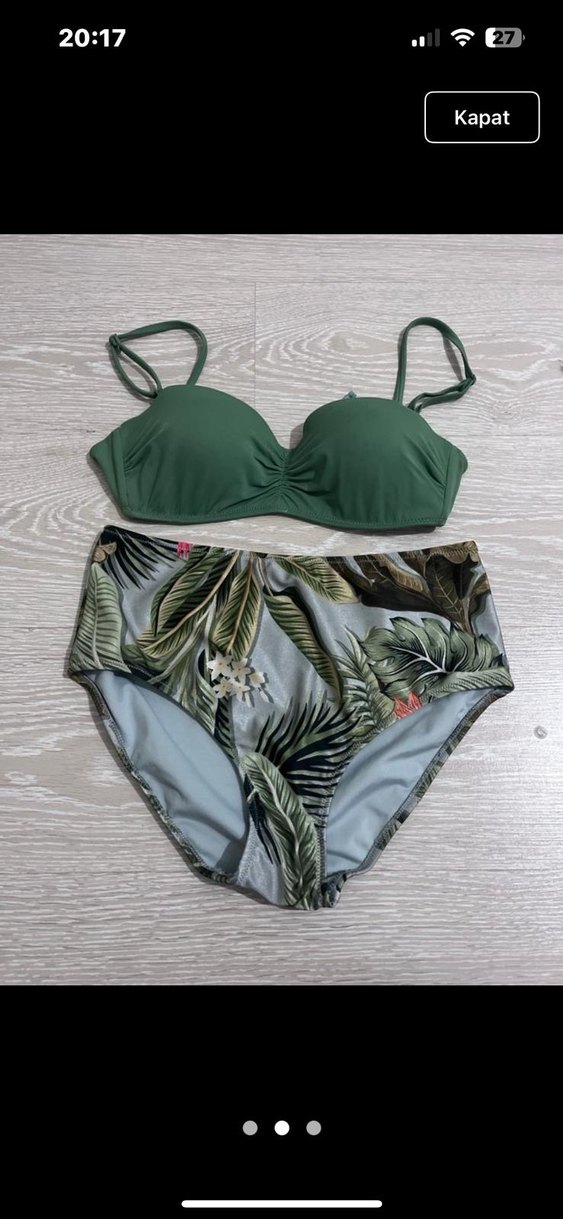 Kadınlar için koyu yeşil askılı üst ve bohem yaprak desenli, bol kesim baskılı alt parçadan oluşan mini bikini. Plaj için rahat ve şık bir seçim.