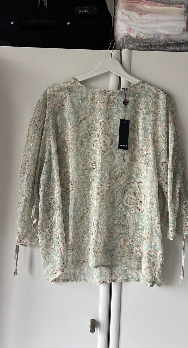 Uzun kollu, yuvarlak yakalı, yeşil pastel tonlarda tie-dye desenli, düğmeli bohem stilde kadın bluz. Rahat ve salaş kesim, günlük kullanım için uygun.