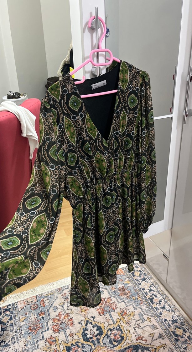 Yeşil desenli, uzun kollu, V yakalı bol kesim elbiseZincir detaylı, bohem tarzda günlük kullanıma uygun.