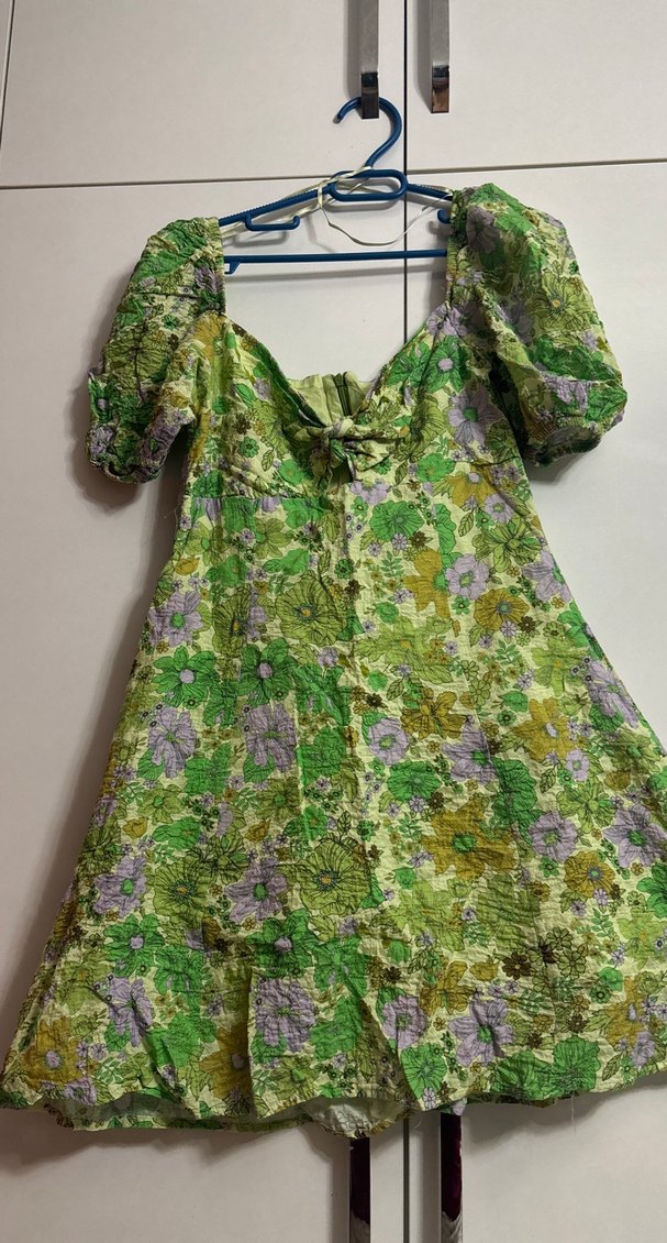 Yeşil pastel tonlarda, düğmeli, straplez yaka ve askılı kollara sahip, gevşek kesim vintage çiçek desenli midi elbise.