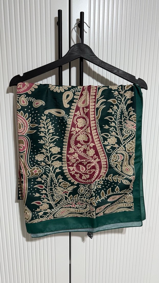Yeşil renkte, dokuma kumaştan, bohem tarzda, drapeli, paisley ve çiçek desenleri bulunan kadın şalı.