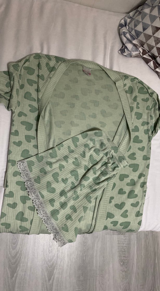 Pastel yeşil tonlarda, baskılı kalp desenli, kısa kollu ve bol kesim mini pijama takımı. Dantel detaylı, rahat ve konforlu.