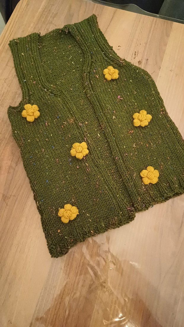 Renkli yeşil örgü kız çocuk yeleği, bol kesim ve boğazlıdır. Kolsuz, sarı nakışlı çiçeklerle bohem tarzını yansıtır.