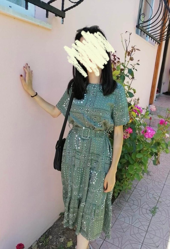 Bu yeşil midi elbise, bol kesimi, tie-dye deseni ve kısa kollara sahiptir. Sentetik kumaştan yapılmış, transparan görünümü ve askısız yakasıyla bohem tarzına uygundur.