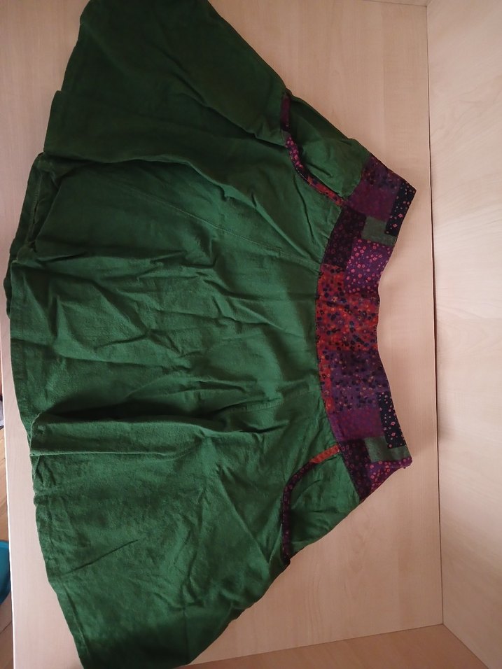 Koyu yeşil renkte, bol kesim ve drapeli detaylara sahip bohem midi etek. Renkli desenli beli ve yumuşak sentetik kumaşıyla rahat bir kullanım sunar.