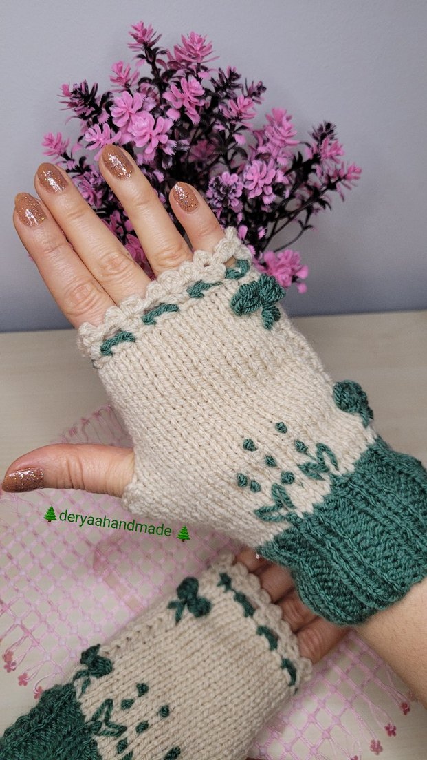 Bohem tarzda, yeşil ve krem renkli, çiçek desenli örgü kadın eldiveni. deryaahandmade tarafından el yapımı.