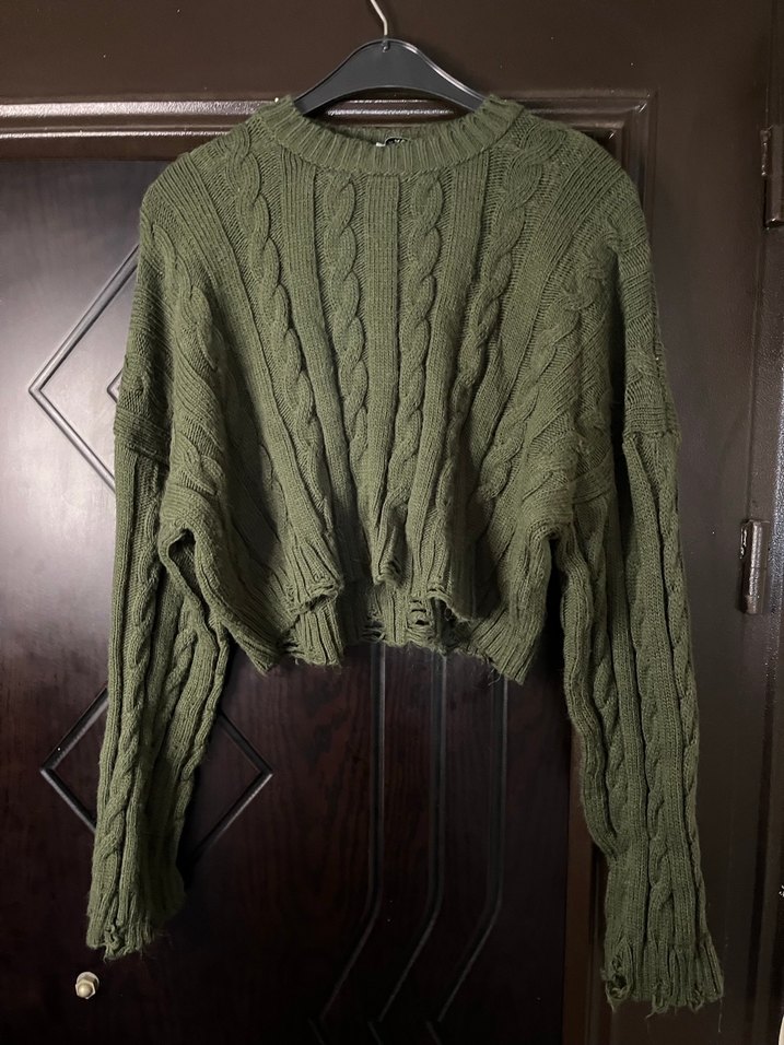 Yeşil renkli, bol kesim, uzun kollu ve bisiklet yaka örgü kadın crop kazak. Bohem tarzda, günlük kullanıma uygun rahat bir modeldir. Çok az kullanıldı beyaz ve sarı ışıkta rengi görselde vardır.