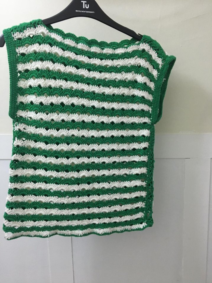 Yeşil ve beyaz çizgili, tekne yaka, örgü kadın süveter. Bol kesim, bohem tarzda, günlük kullanıma uygun rahat bir modeldir.