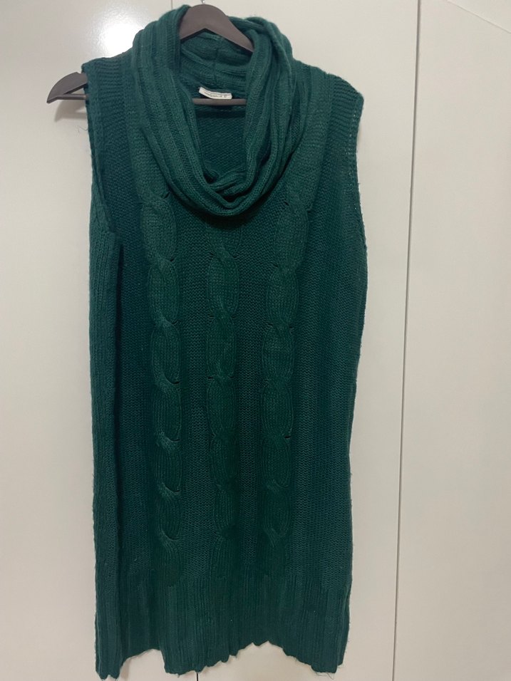 Koyu yeşil renkte, kolsuz ve uzun kesime sahip, bohem tarzda örgü kazak. Fit kesimi ve rahat boğazlı yakası günlük kullanıma uygundur. Ürün az kullanılmış temiz Avrupadan geldi Yesika marka Boy 92 cm genişlik 58cm