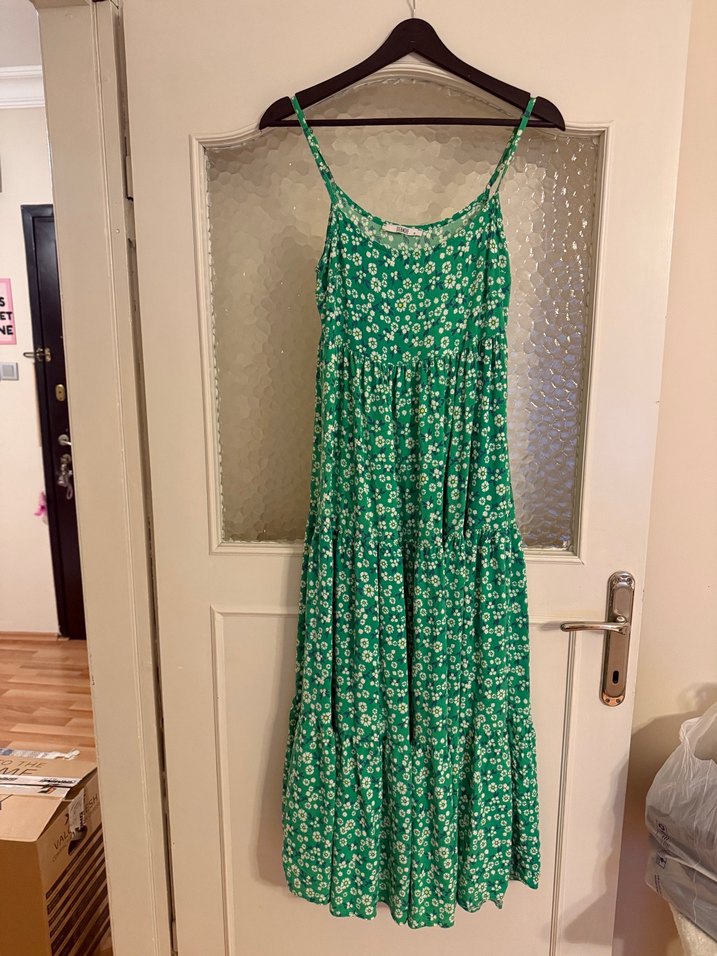 İnce askılı, pile detaylı, salaş kesim uzun elbise. Yeşil renkli, batik desenli, sentetik yumuşak kumaştan yapılmıştır.