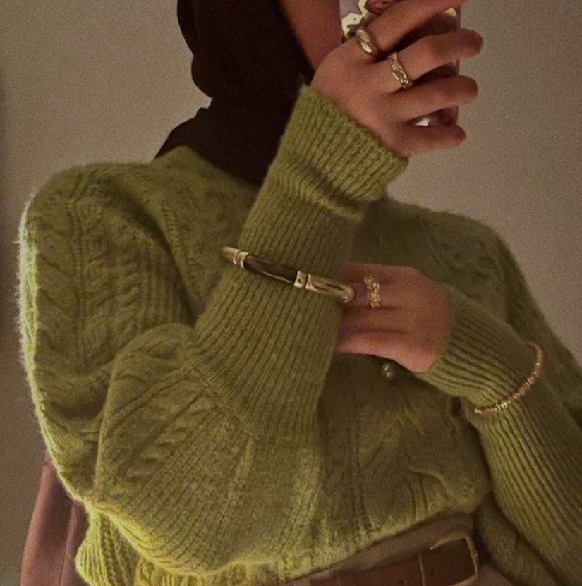 Yeşil Bohem Tarz Khaki Boğazlı Örgü Kazak