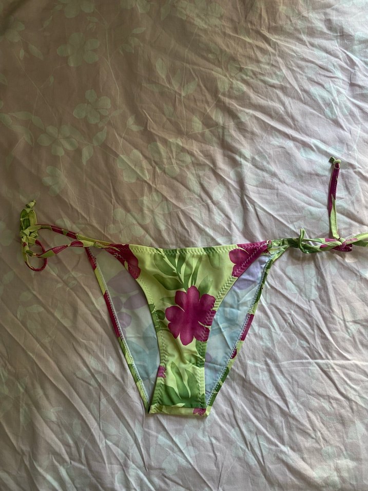Yeşil, pastel çiçek desenli, bağlamalı ve oturan kesimli bikini altı, plaj için uygun rüf