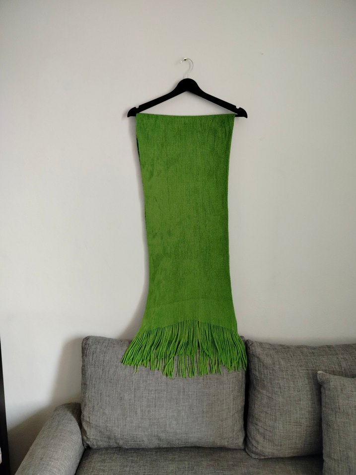 Yeşil renkte, bohem tarzda, dökümlü ve sentetik kumaştan yapılmış kadın şalı. Uçları püsküllü, rahat ve retro bir görünüm sağlar.