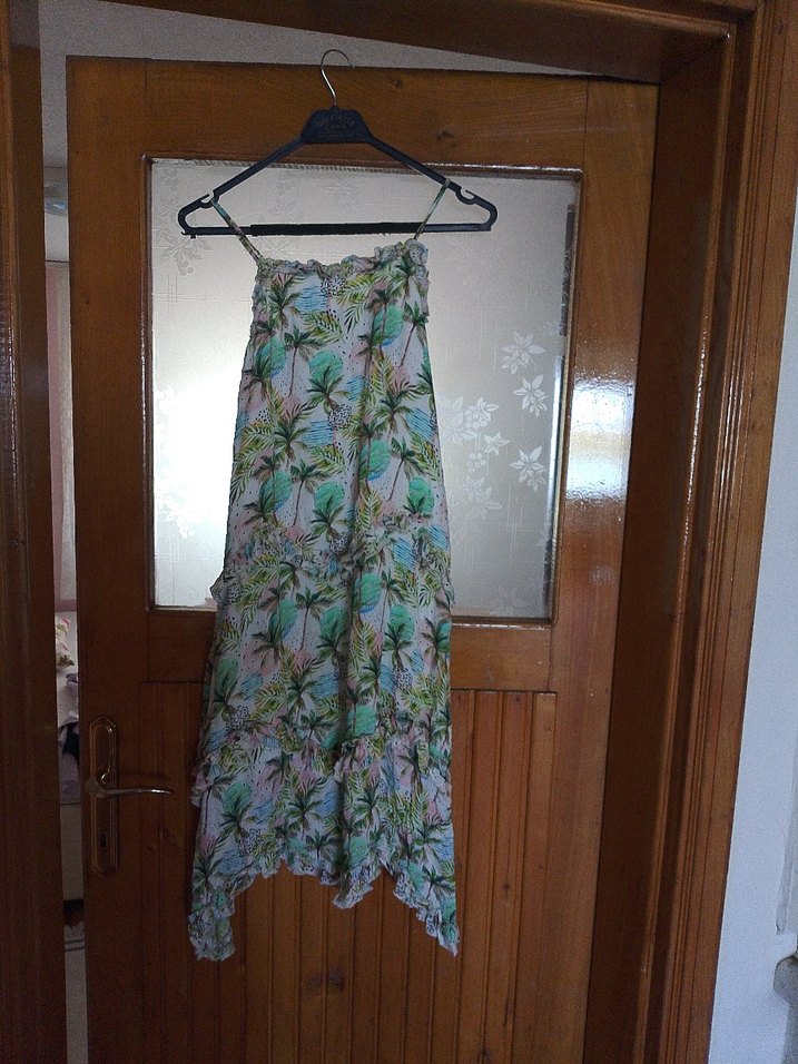 Yeşil renkte, askılı ve straplez yaka detaylı uzun elbise. Pastel tonlarda batik desenli, bol kesim ve dökümlü yapıya sahip, yumuşak dokulu kumaştan üretilmiştir.beden yazmıyor m bedene göredir.