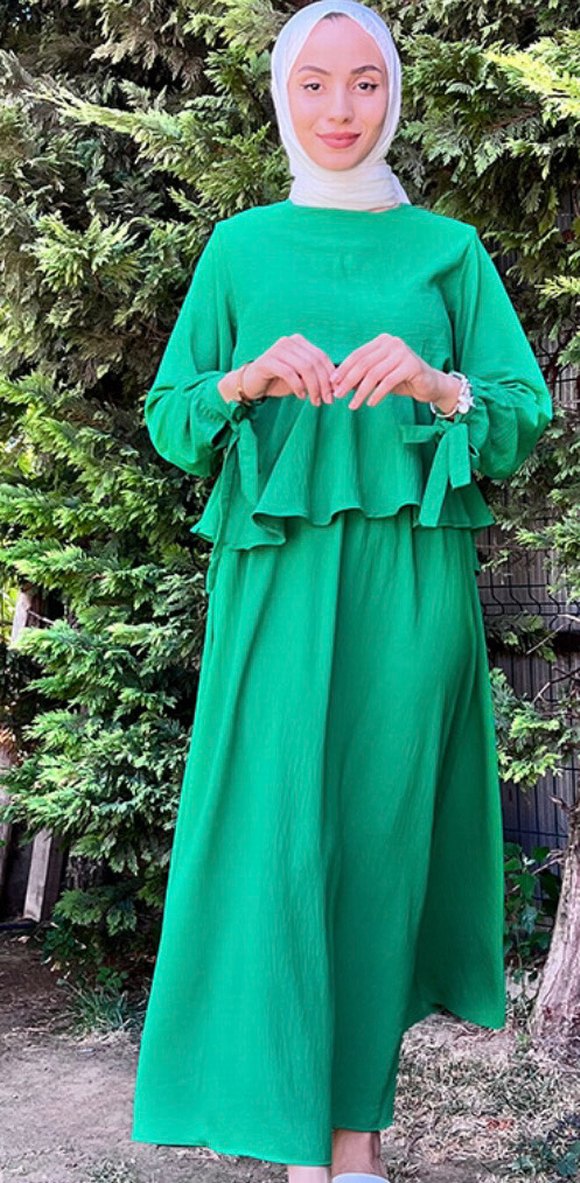Yeşil renkte, ayrobin kumaştan üretilmiş, bol kesim ve drapeli uzun bohem elbise. Uzun kollu, fiyonk detaylı ve yuvarlak yakalı, sade ve mütevazı tarzda günlük kullanım için uygun.