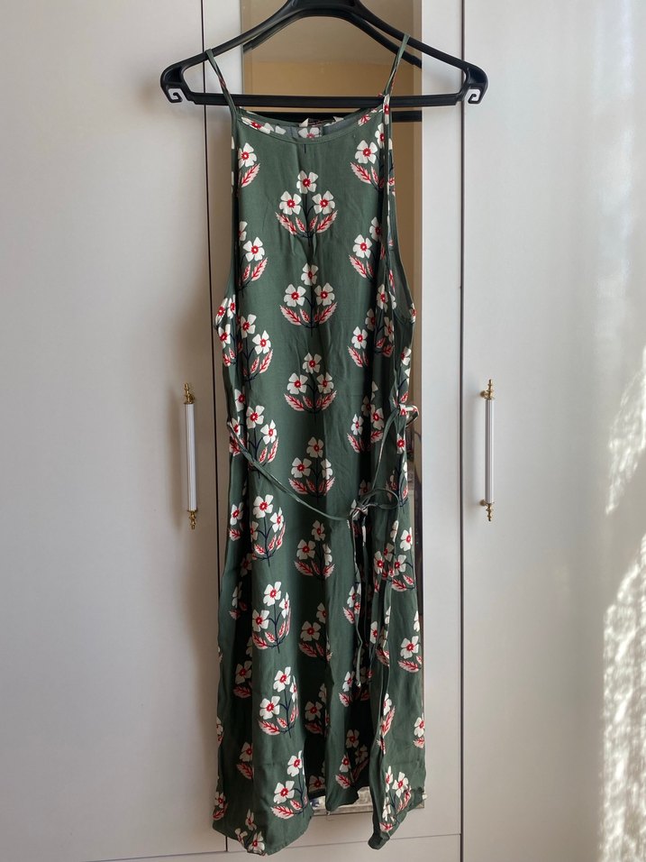 Yeşil renkte, desenli, askısız, bol ve drapeli kesime sahip bohem tarzda uzun elbisedir.