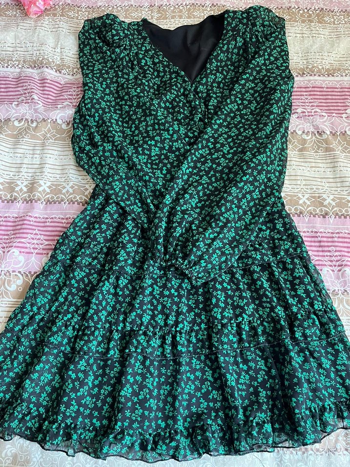 Koyu yeşil renkte, bol kesim ve V yaka detaylı uzun elbise. Fırfırlı, bağlamalı kol ve batik desenli, sentetik kumaştan bohem tarzda. Temiz ürün marka temsili