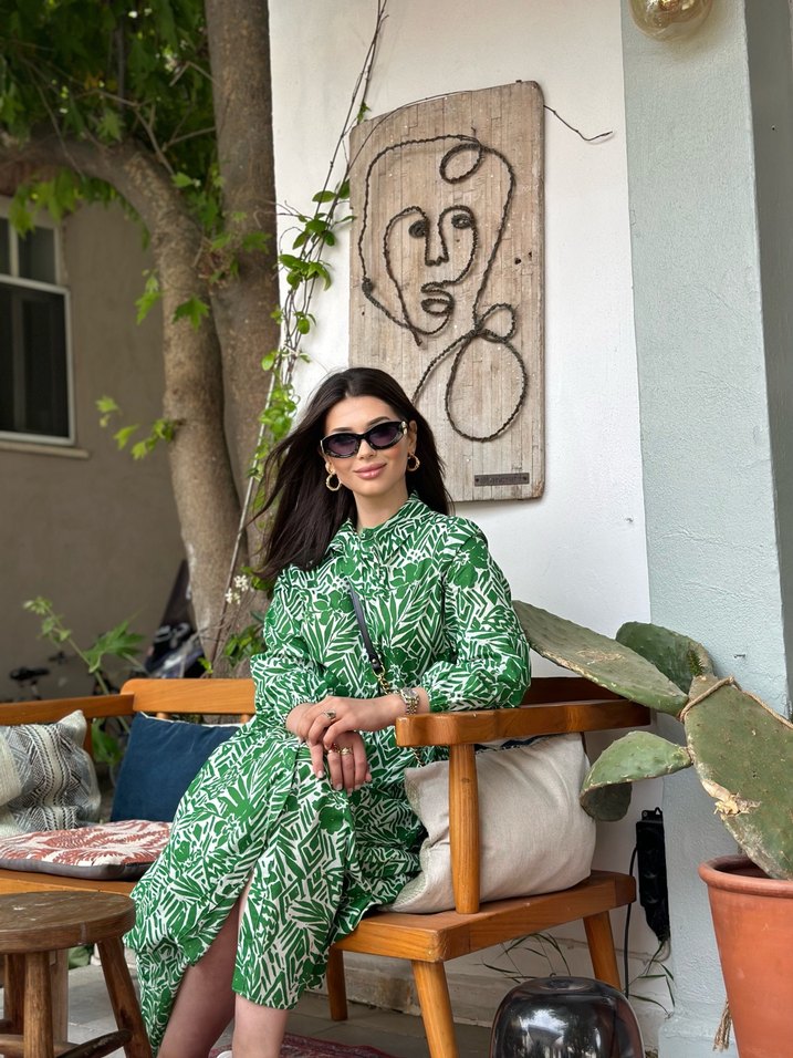 Parlak yeşil renkte, uzun kollu, yüksek yakalı ve dökümlü tasarıma sahip bol kesim bohem elbise.