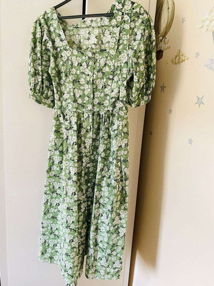 Yeşil uzun elbise, bol kesim ve drapeli tasarıma sahiptir. Pastel çiçek desenli, kısa kollu ve V yakalıdır, vintage bohem tarzı için uygundur.