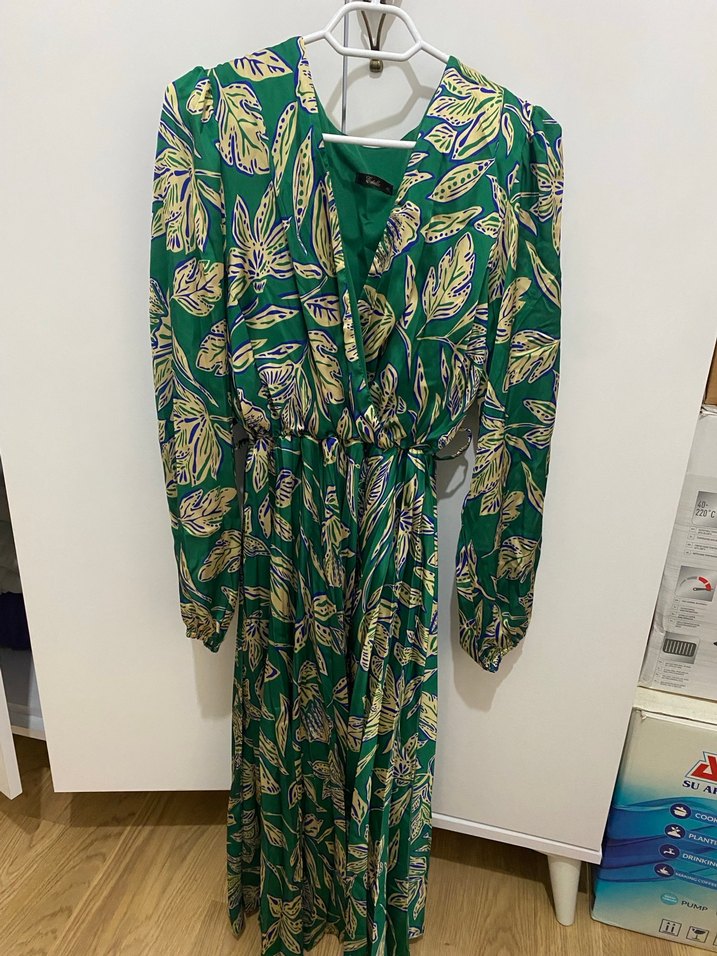 Uzun, bol kesim ve V yakalı koyu yeşil elbise. Yumuşak sentetik kumaştan, drapeli ve batik desenli bohem tarzda.