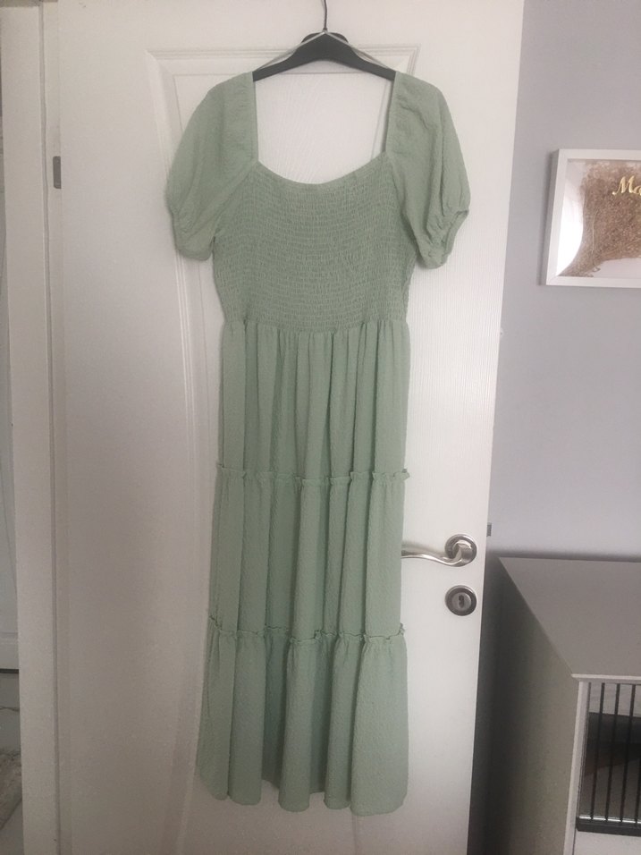Nefes alabilen keten kumaştan, bol kesim, uzun ve pilili, yeşil bohem elbise. Kare yaka ve balon kollu, günlük kullanım için uygundur.