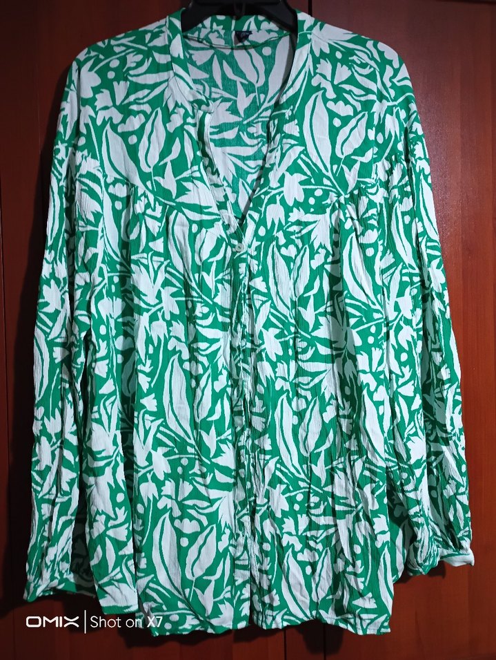 Yeşil, uzun kollu, V yaka ve pileli detaylı bol kesim bluz. Hafif batik desenli, yumuşak sentetik kumaştan bohem tarzda.hic giyilmedi cokrahat bir kumaşı var