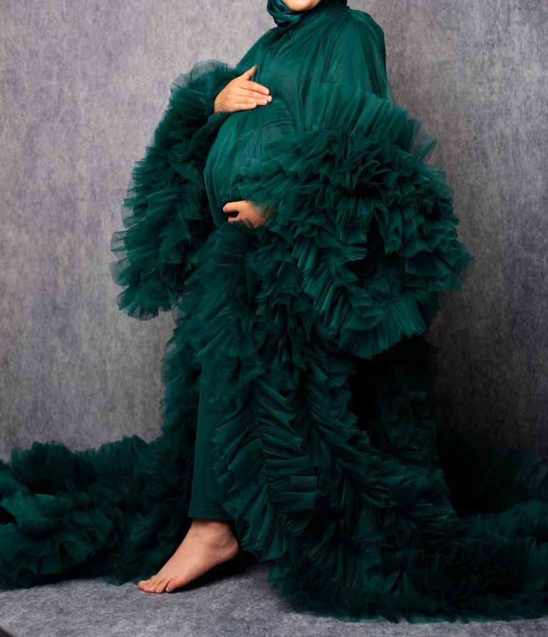 Koyu yeşil, bohem tarzda, uzun kollu ve boğazlı, drapeli desenli hamile abiye elbise. Parti için şık ve modern bir seçenek.