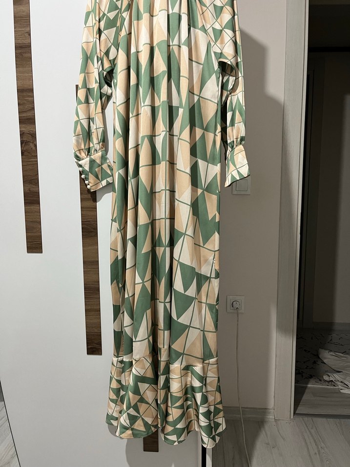 Yeşil renkli uzun kollu, yüksek yakalı, bol kesim ve drapeli tasarıma sahip, sentetik kumaştan yapılmış bağlama desenli uzun elbise.