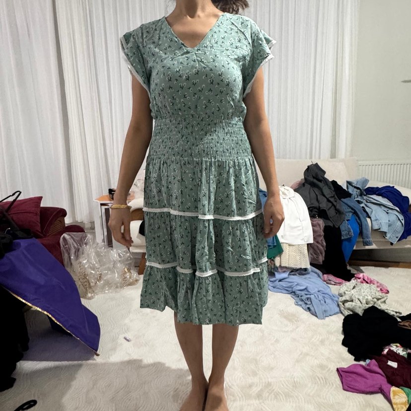 Yeşil bohem tarzda, V yakalı ve kısa kollu midi elbise. Bağlama desenli, fırfırlı ve rahat pamuk kumaştan üretilmiştir.