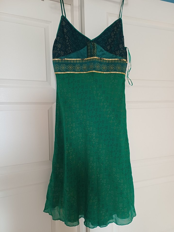 Yeşil, v yaka ve drapeli detaylara sahip, midi elbise. Bohem tarzı ve kolsuz yapısıyla romantik akşamlar için uygun.