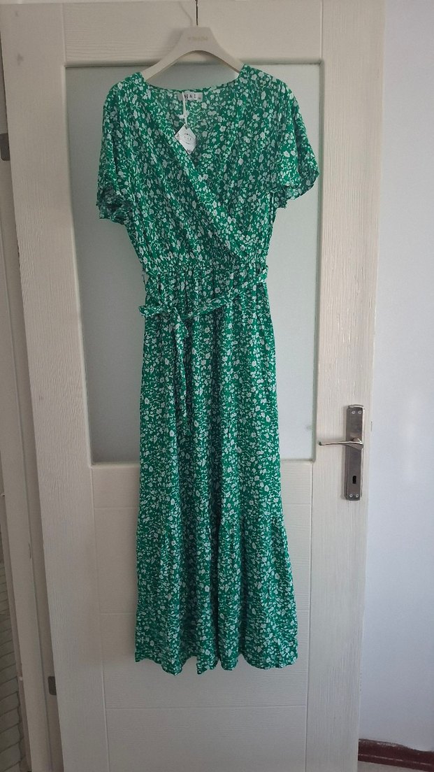 Açık yeşil, bol kesim, drapeli, kısa kollu ve V yakalı bohem elbise. Bağlamalı ve batik desenlidir, açık hava etkinlikleri için uygundur. Hiç açılmamış paket içinde mevcut. Beden: M