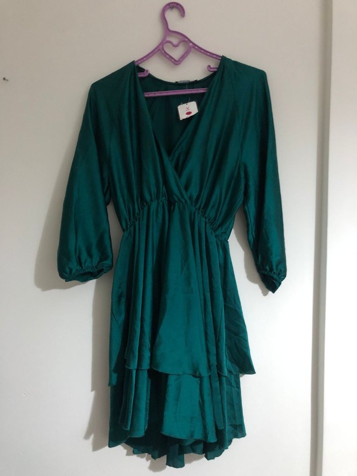 Yeşil bohem tarzda, V yakalı, uzun kollu, bol kesim ve drapeli midi elbise. Romantik akşamlar için uygundur.