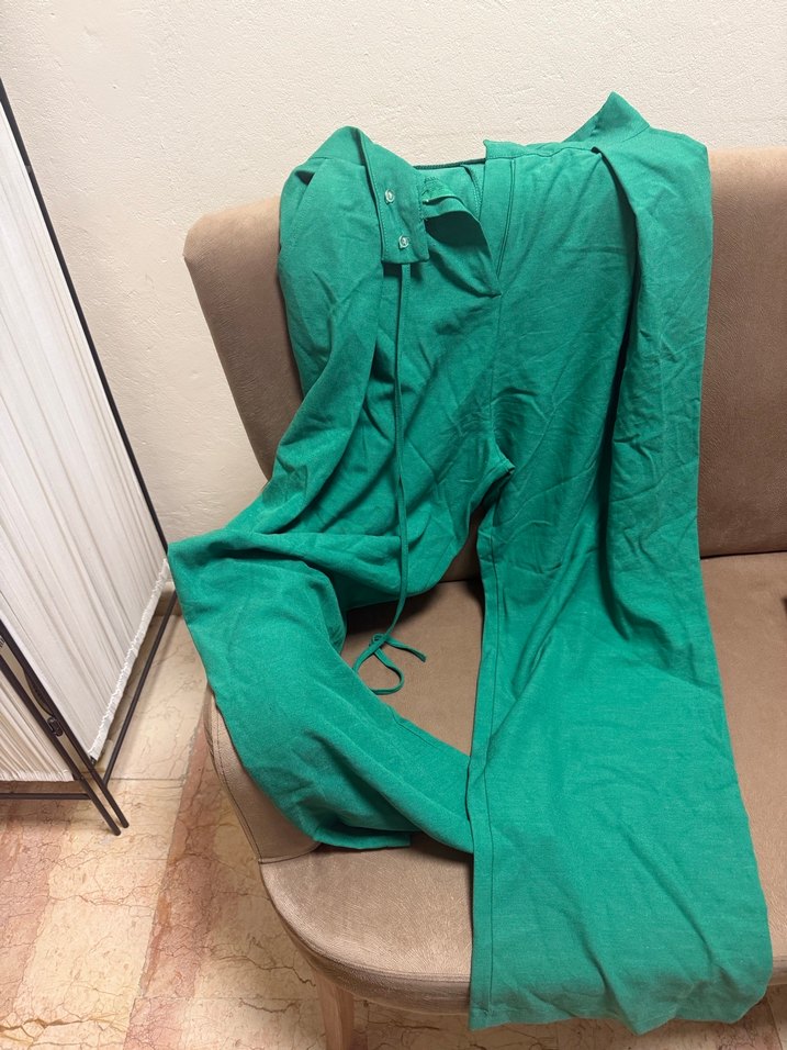 Uzun, bol kesim kadın keten pantolonlar, koyu yeşil renkte yumuşak kumaştan üretilmiştir. Rahat ve salaş sokak stili için drapeli tasarıma sahiptir.