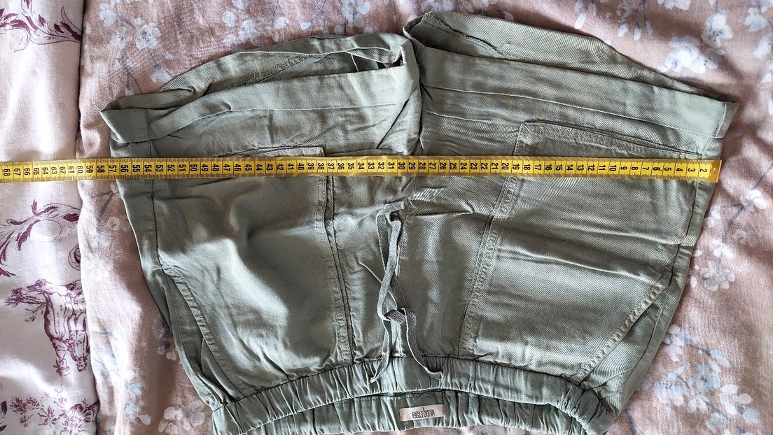 Yeşil renkte, bol kesim, keten kumaştan yapılmış, fermuarlı cepleri ve mini boy tasarımıyla günlük kullanıma uygun kadın şort.
