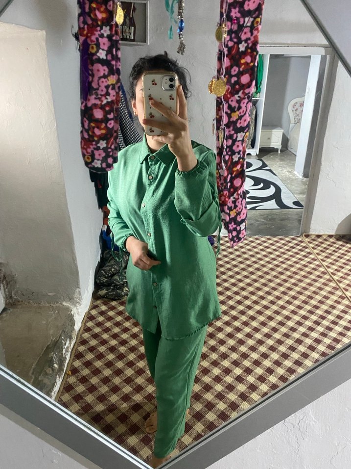 Uzun kollu, keten dokulu, düğmeli ve yaka detaylı yeşil bol kesim takım, gündelik kullanım için uygun. Picama lastiği sökük var
