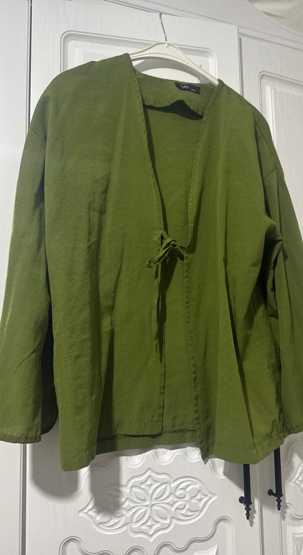 Yeşil renkli keten dokulu, bol kesim ve uzun kollu kimono. Notched lapel yakalı, parlak ve midi boyda, günlük kullanım için uygun.