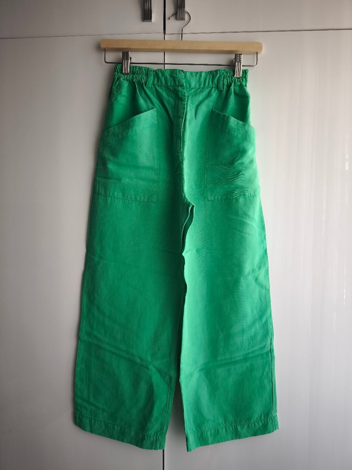 boy 85 cm bel lastikli Yumuşak keten kumaştan, parlak yeşil renkte, bol kesim midi pantolon. Ön cepleri ve elastik bel bandı rahatlık sağlar.