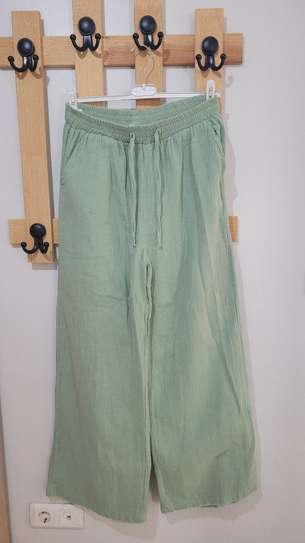 Uzun, bol kesim yeşil keten pantolon, kemerli ve yumuşak dokuludur. Desensiz, pastel tonu günlük bohem tarzına uygundur. SIFIR ÜRÜNDÜR KULLANILMADI YIKANDI