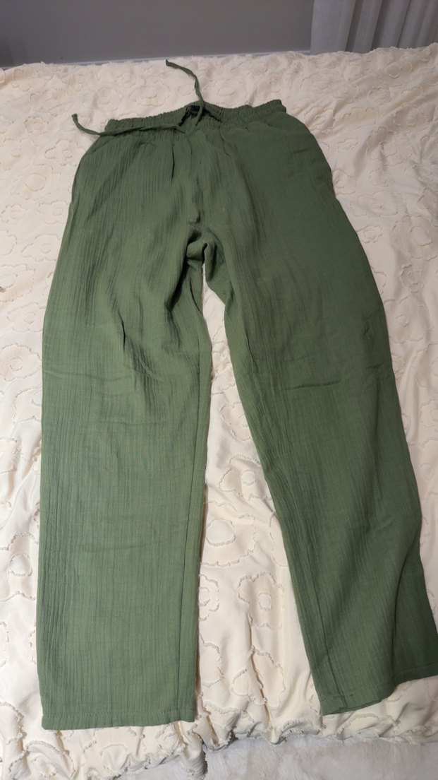 Yeşil renkte, Müslüm kumaştan, bol kesim ve pileli detaylı midi uzunlukta kadın pantolonu. Rahat ve bohem tarzda, günlük kullanıma uygun.