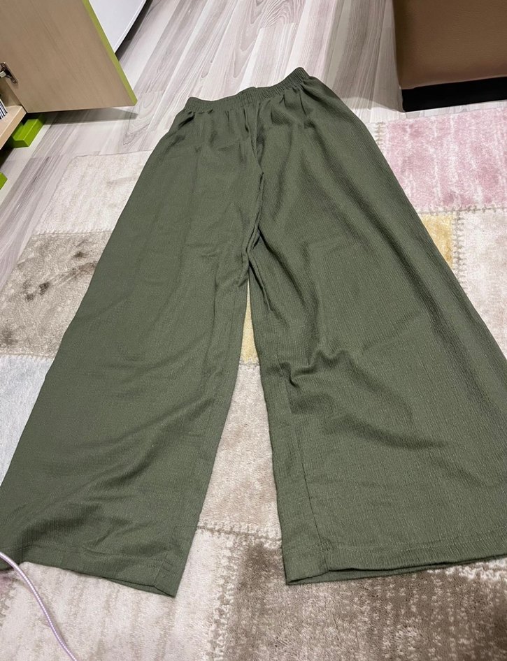 Bol kesim, uzun yeşil keten pantolon, pliseli detayıyla günlük ve sokak stiline uygun rahat ve trend bir modeldir.