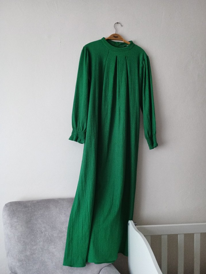 Yeşil renkte, yüksek yakalı ve pile detaylı uzun keten elbise. Uzun kollu ve bol kesim olup rahat kullanım sunar. Minimalist bohem tarzda, günlük kullanıma uygun.