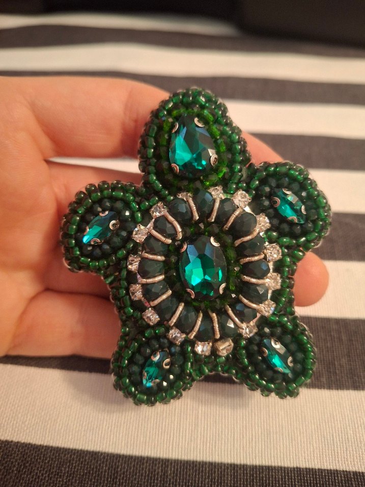 Yeşil boncuklarla işlenmiş, renkli nakış detaylı kadın broş, bohem ve gösterişli tarzı yansıtır, düğün için uygundur.
