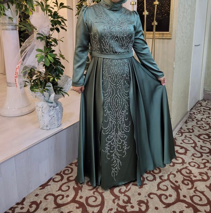 Yeşil renkli, boncuk işlemeli ve drapeli detaylara sahip uzun kollu, yüksek yakalı abiye elbise. Düğünler için klasik ve şık bir seçenek.